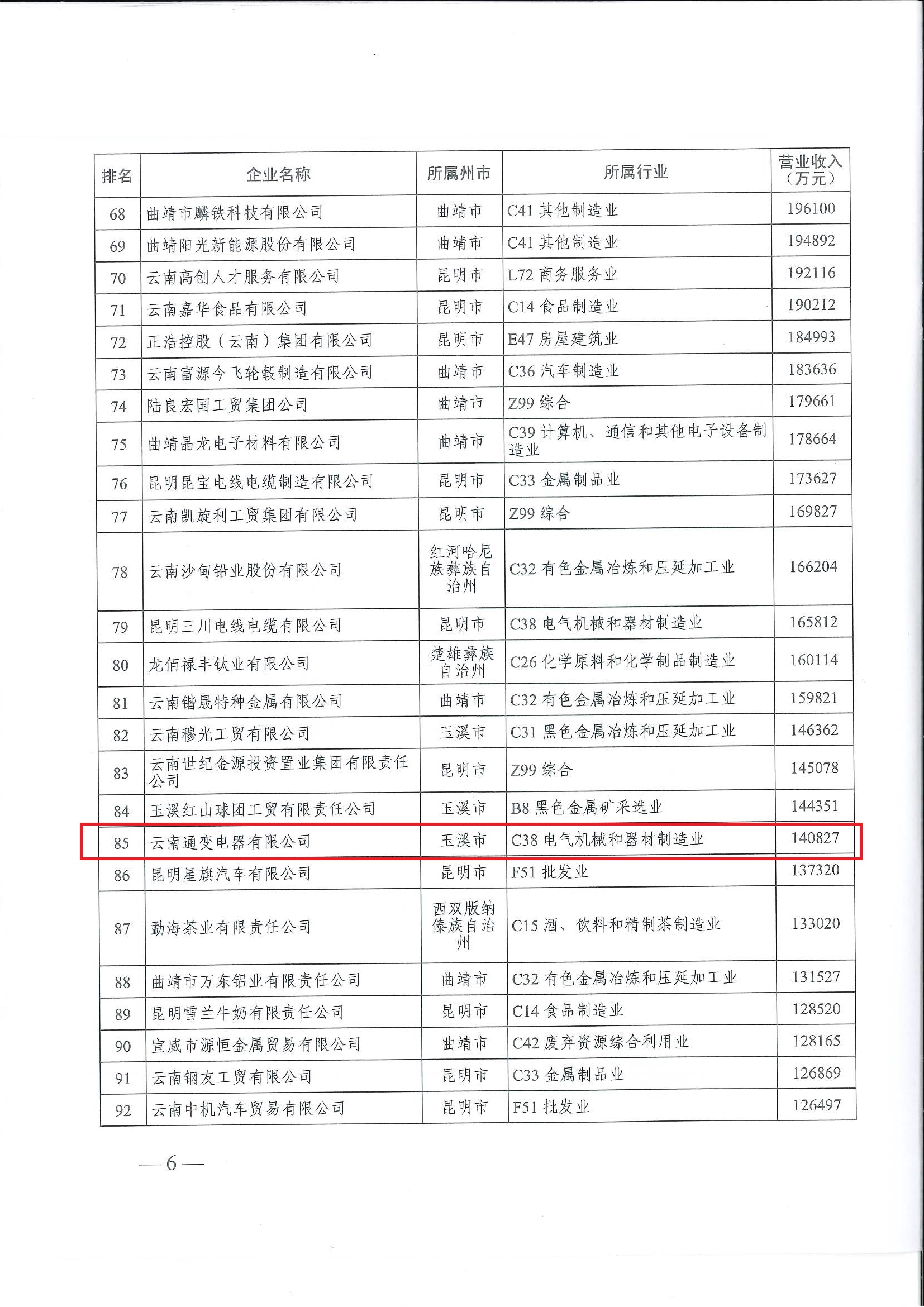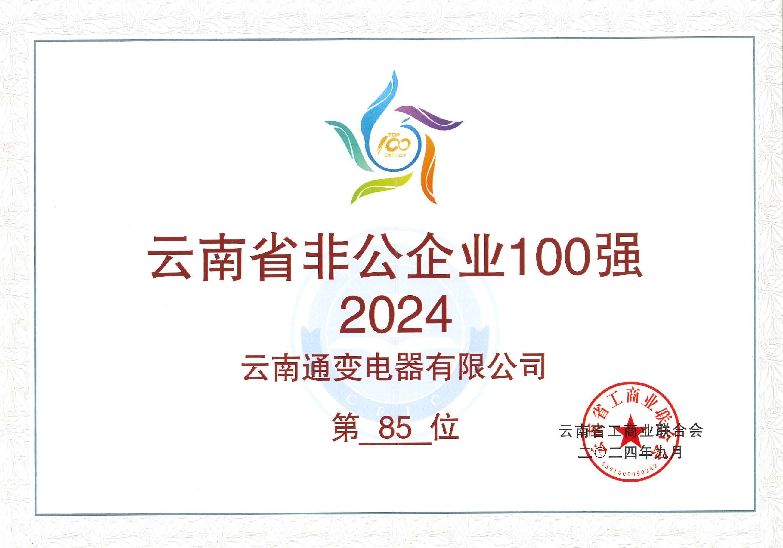 云南通變電器有限公司連續(xù)12年入圍“云南省非公企業(yè)100強(qiáng)”